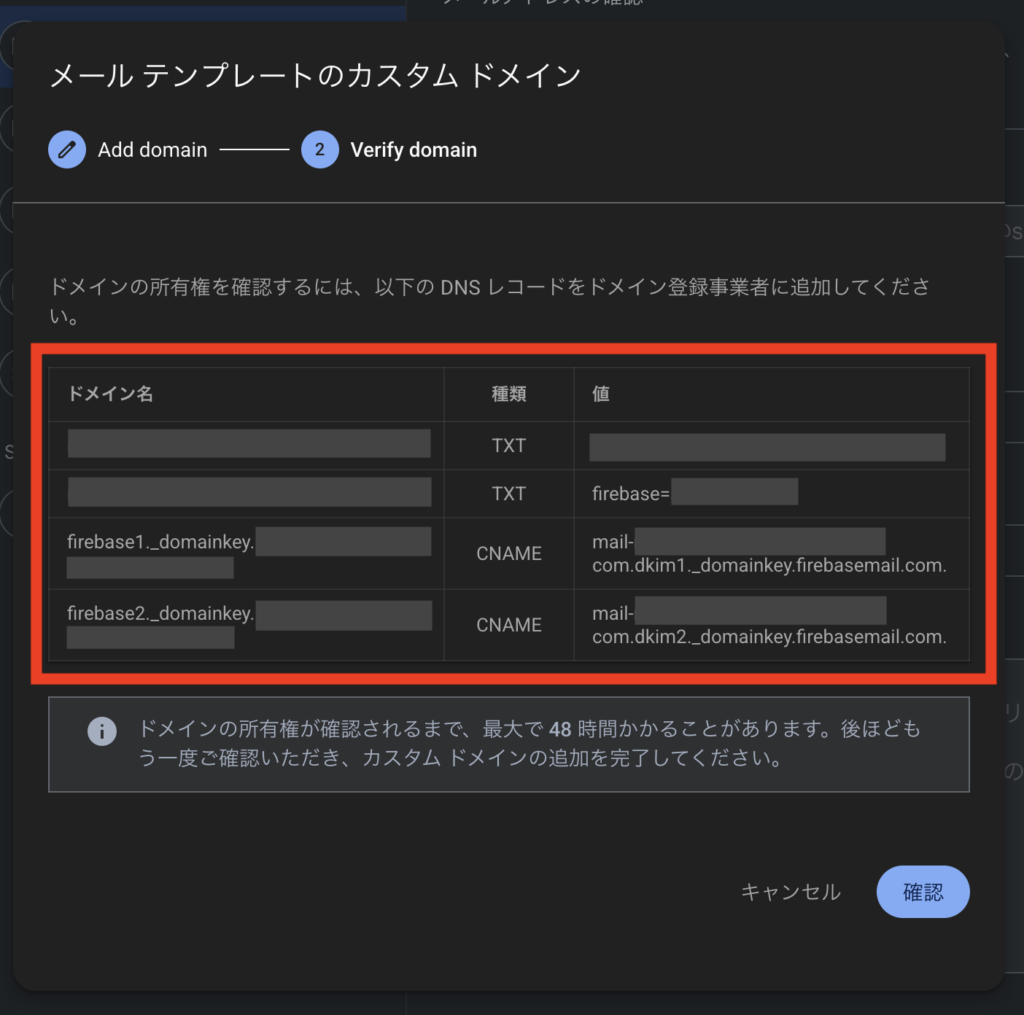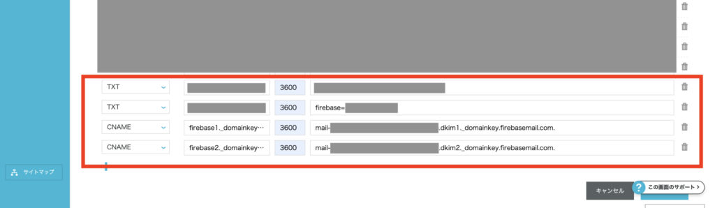 Firebase から指定される値を使って、CNAME レコード等を追加します。