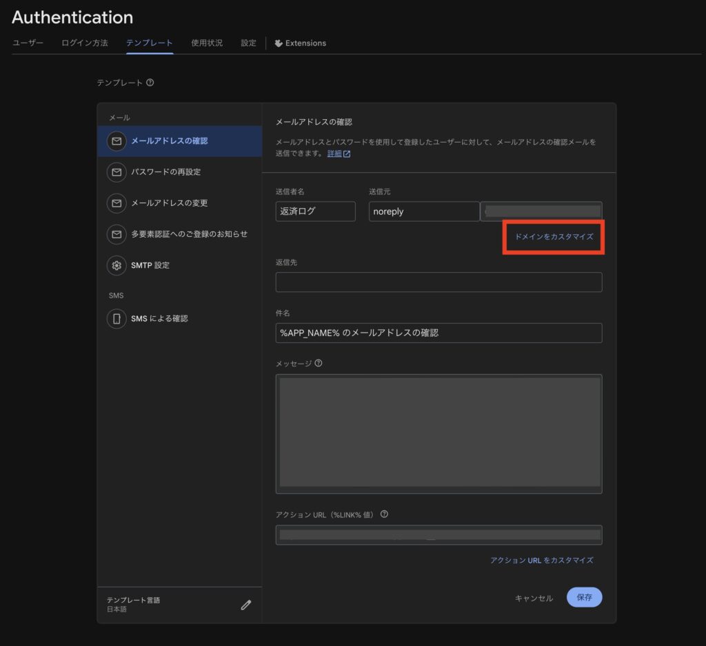 Firebase コンソール → Authentication → 設定 → カスタムドメイン を開きます。