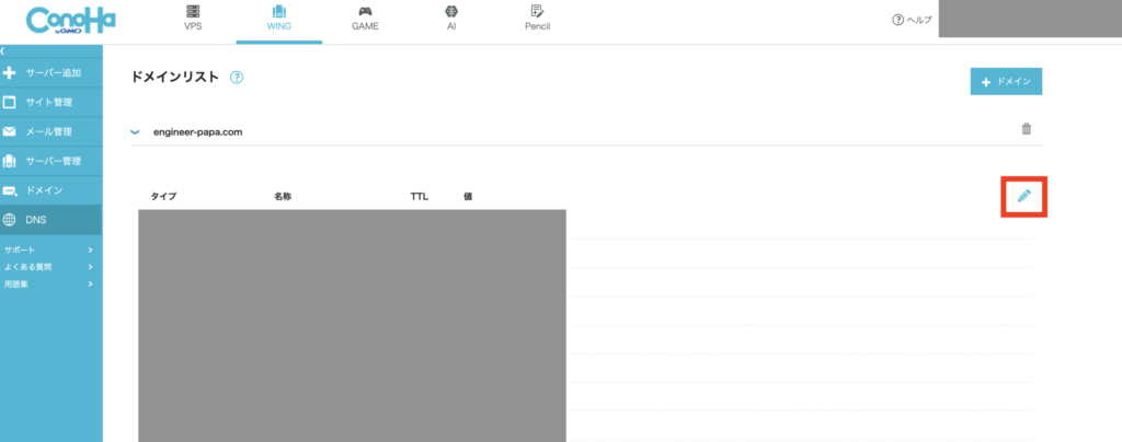 ConoHa WING の管理画面から「DNS」→ 対象ドメインを選択します。