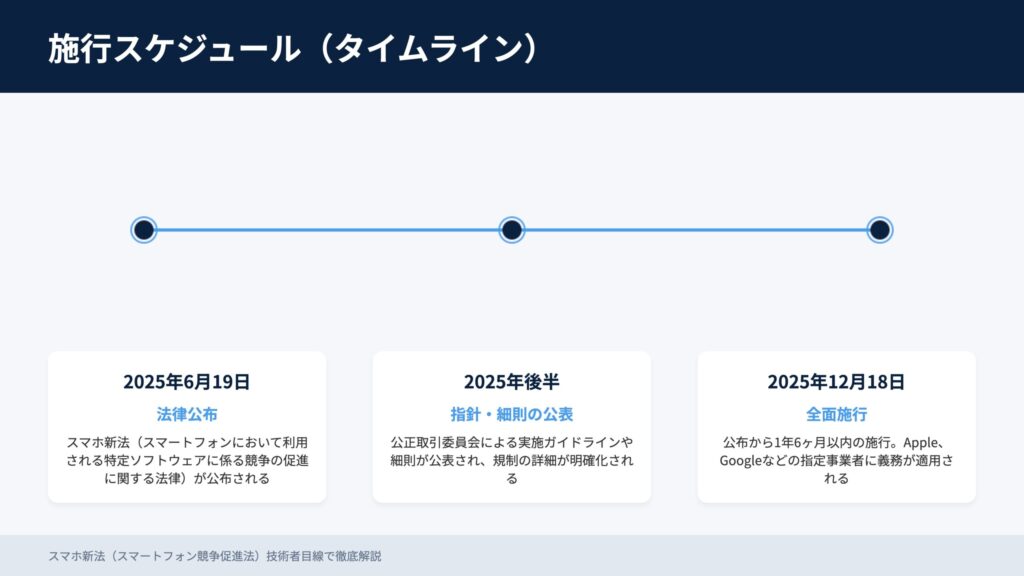 2025/06/19 公布 → 2025年後半 ガイドライン公表 → 2025/12/18 全面施行(予定)。指定事業者への義務が本格適用されます。