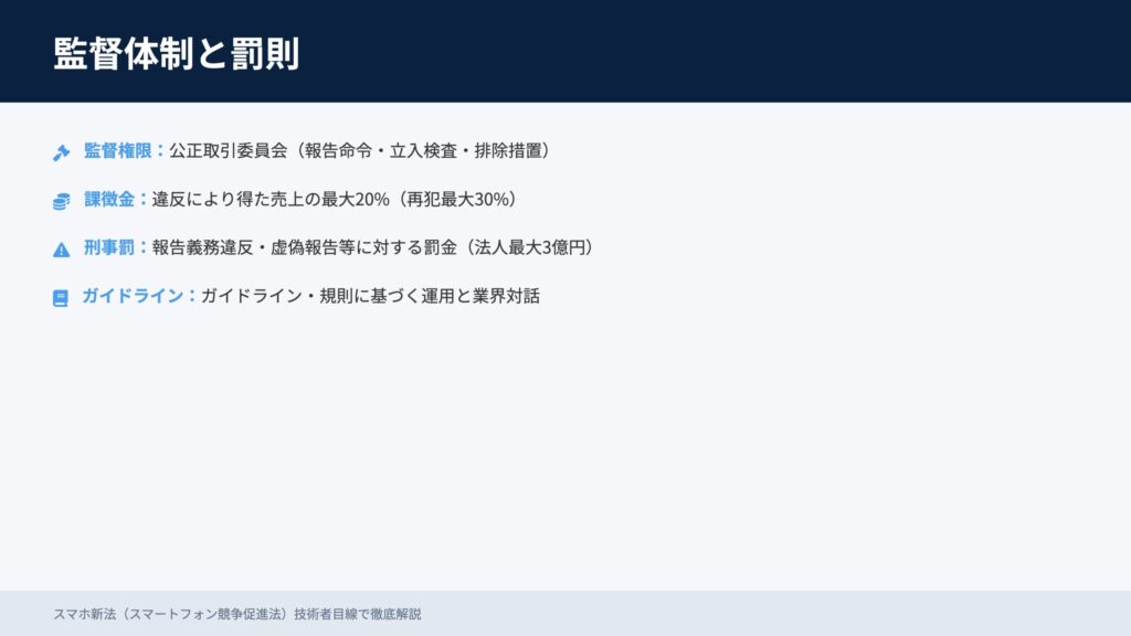 執行は公正取引委員会。課徴金は違反売上の最大20%(再犯最大30%)、報告義務違反や虚偽報告には刑事罰(法人最大3億円)も。今後はガイドラインが整備され、対話を通じた実務運用が進みます。