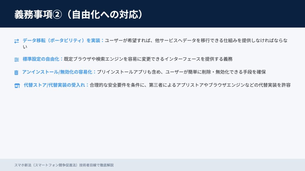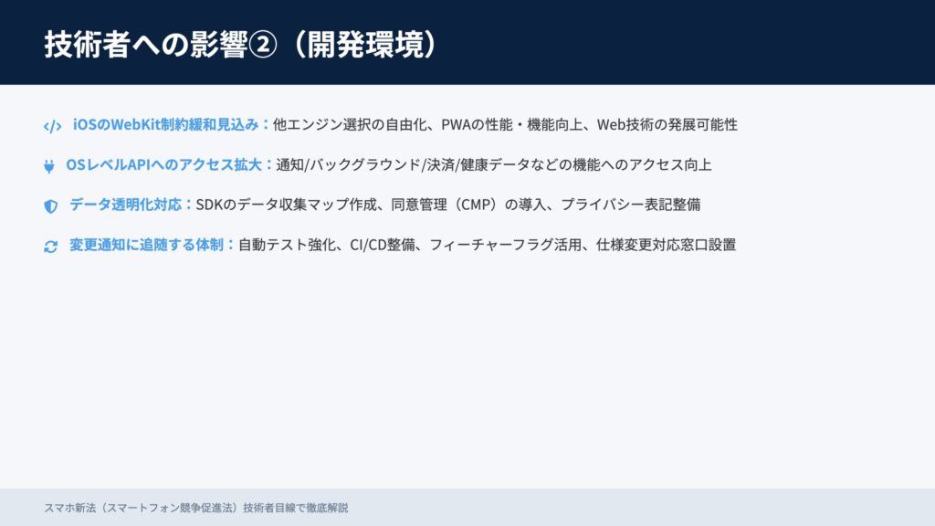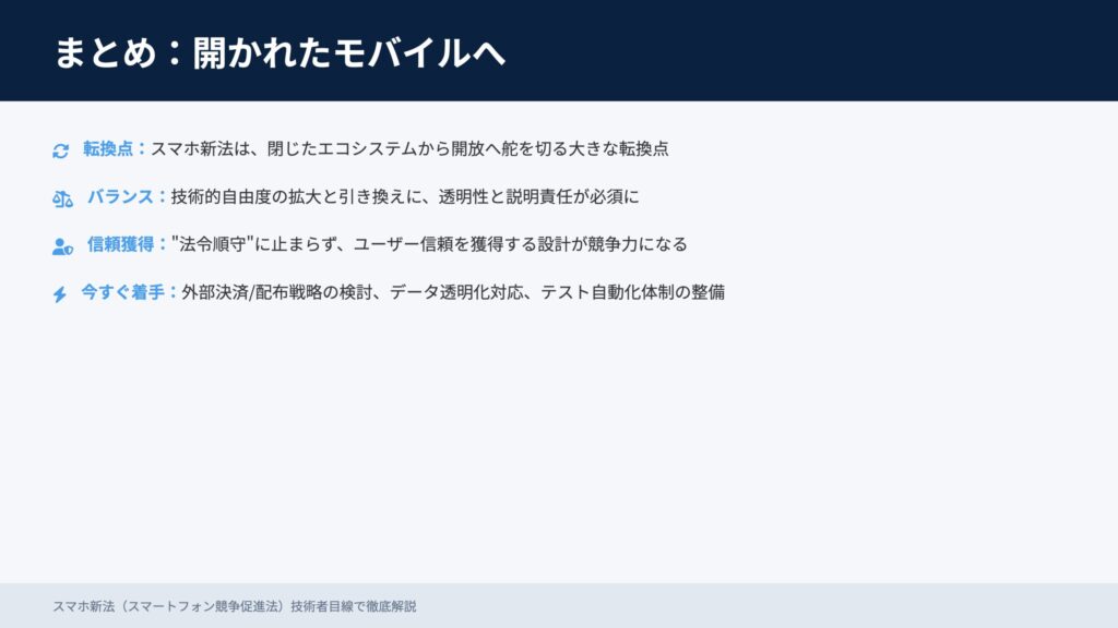 スマホ新法は、閉じたエコシステムから開放へ舵を切る転換点です。技術的自由度の拡大と引き換えに、透明性と説明責任がこれまで以上に重要になります。