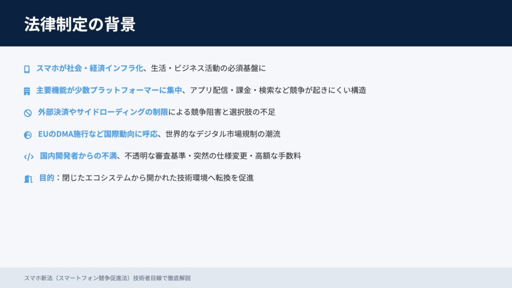 スマホが生活・経済のインフラとなる中、アプリ配信・課金・検索などの中核機能が少数事業者に集中。外部決済や代替ストアの制限、不透明な審査や高額手数料が課題でした。EUのデジタル市場法(DMA)が世界の流れを後押しし、日本でも「閉じたエコシステム」から「開かれた技術環境」へ転換する必要が高まった──それが本法の背景です。