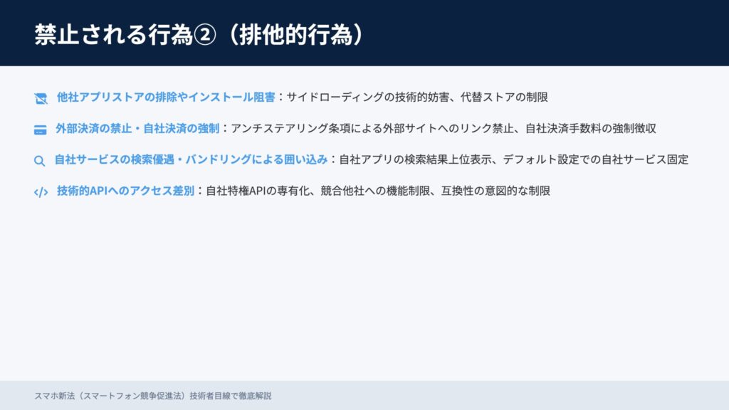 • APIアクセス差別:自社優遇・他社制限、互換性阻害