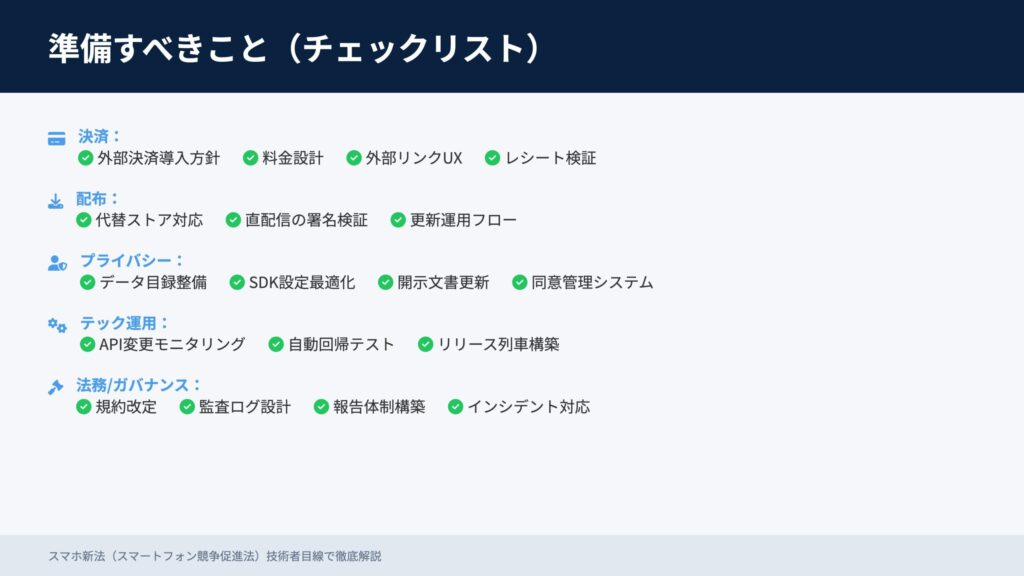 まずは外部決済/配布戦略の見直し、データ透明化対応、自動テスト体制の強化から着手しましょう。