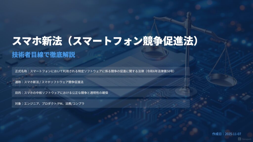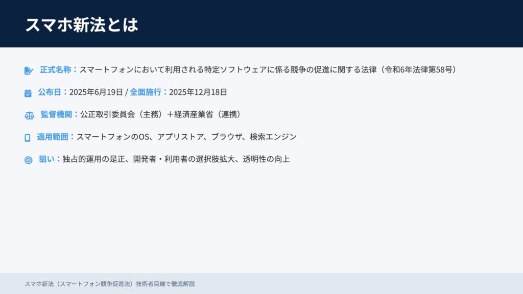 正式名称は「スマートフォンにおいて利用される特定ソフトウェアに係る競争の促進に関する法律」。スマートフォンのOS、アプリストア、ブラウザ、検索エンジンを提供する巨大プラットフォーム事業者に対し、公正な競争と透明性の確保を義務づけます。監督は公正取引委員会(経済産業省と連携)。公布は2025年6月19日、全面施行予定は2025年12月18日です。