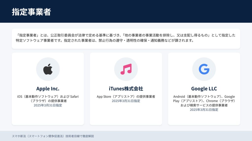 指定事業者は、公正取引委員会が法の基準に基づき指定。例として、Apple(iOS/Safari)、iTunes株式会社(App Store)、Google(Android/Google Play/Chrome/検索)などが想定されます(資料のスライドは理解促進のための例示)。