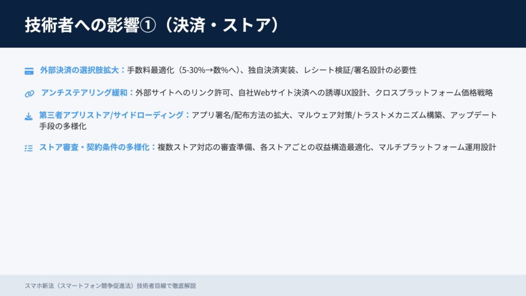 • 外部決済の選択肢拡大:手数料最適化、独自決済実装、レシート検証・署名設計