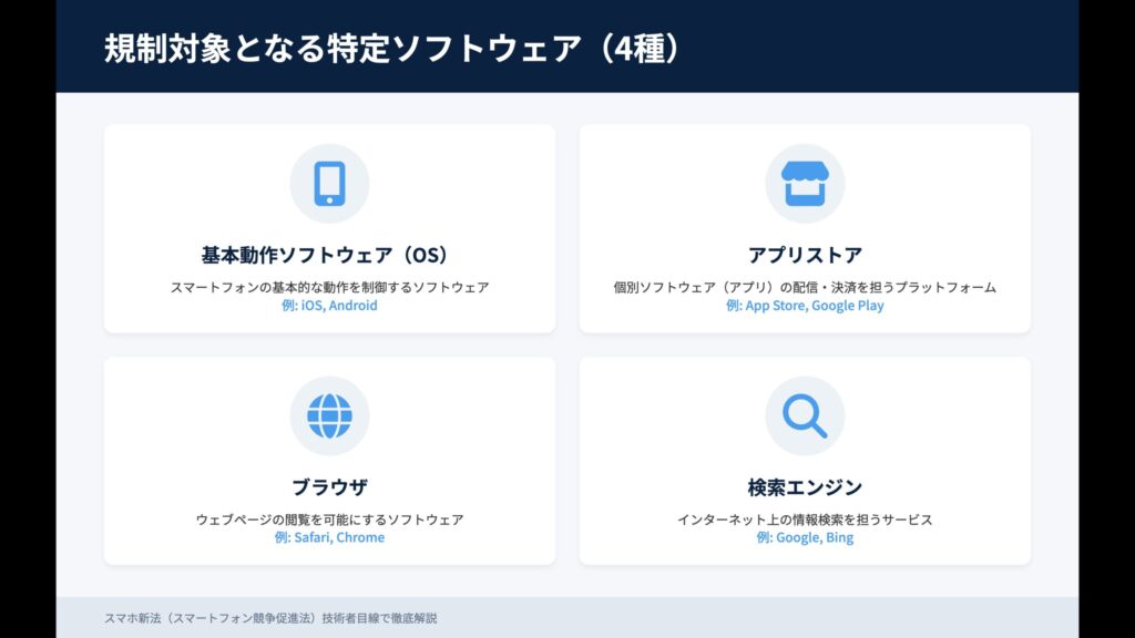 本法の対象となる「特定ソフトウェア」は、OS / アプリストア / ブラウザ / 検索エンジンの4分類。これらを提供し、市場支配力を持つ企業が指定事業者として規制の中心となります。