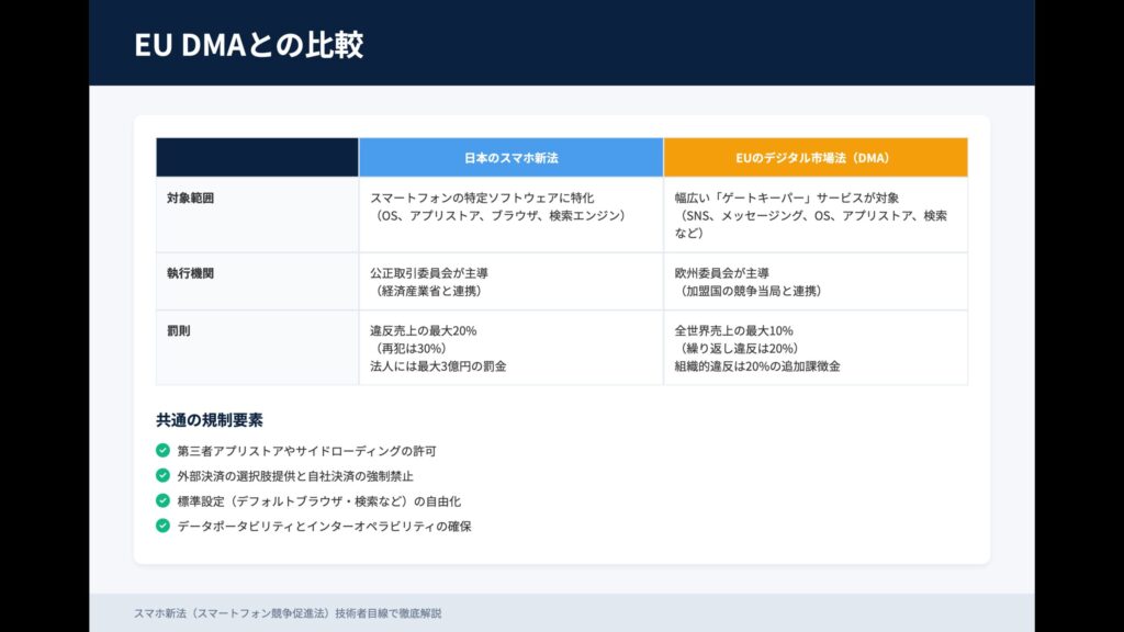日本のスマホ新法は対象をスマホの中核ソフトウェアに絞りつつ、外部決済・代替ストア・標準設定の自由化・データポータビリティなど主要要素はDMAと共通しています。