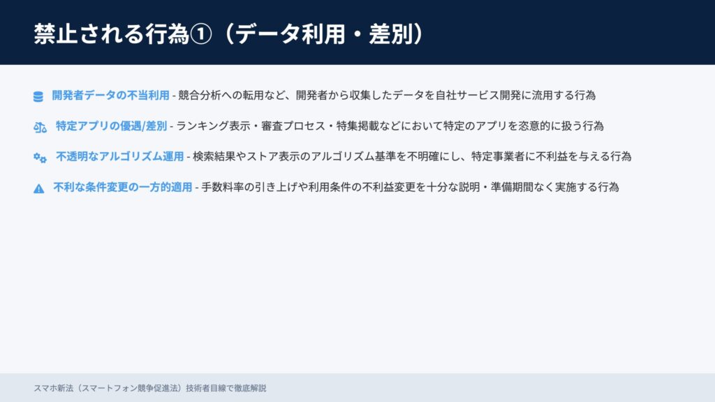 • 開発者データの不当利用:収集データの自社優遇転用など